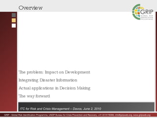 The document discusses managing disaster information to support disaster risk reduction efforts. It outlines how establishing national disaster observatories can systematically collect, analyze, and disseminate disaster data to various stakeholders. This information can then be used to inform national disaster risk reduction strategies, risk assessments, and development decisions by providing evidence of hazards, vulnerabilities, and impacts. The document advocates for integrating disaster data into policy and planning to promote more effective disaster risk management.