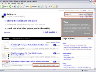 Web 2.0 ? Browsers, RSS Readers, anything Viewed through… Web browser Everyone Content Created by… Web Coders “ dynamic” State “ static” “ mass amatuerization” Domain of… “ geeks” “ Post / record” Primary Unit of content “ Page” “ Web Services” Architecture “ Client Server” “ Write” & Contribute Mode “ Read” Web 2.0 (2003- beyond) Web pages, plus a lot of other “content” shared over the web, with more interactivity; more like an application than a “page” Web 1.0 (1993-2003) Pretty much HTML pages viewed through a browser
