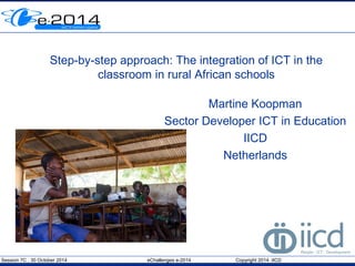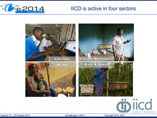 The document discusses IICD's approach to integrating ICT in rural African schools. IICD focuses on educational change, not just technology, and works across sectors like education, health, water and climate. A pilot program in Malawi equipped schools with low-cost tablets, digital textbooks, and teacher control, and found an holistic approach that considers the educational system works best for success. Impact studies are underway in Ghana and Zambia to evaluate results from 2012-2013, with final results due in March 2015.
