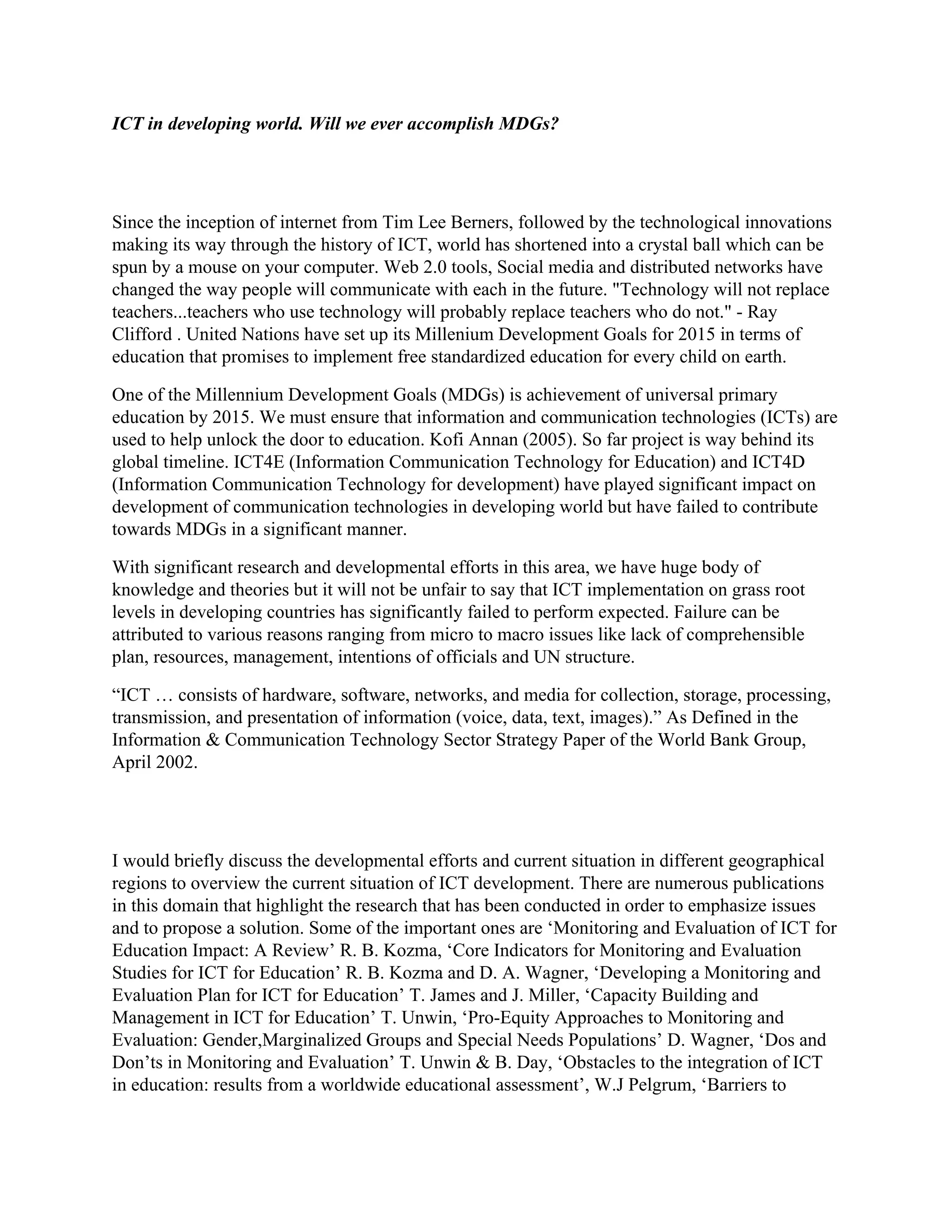 While ICT innovations and initiatives have helped expand access to education in developing areas, they have largely failed to meaningfully contribute to achieving the UN's Millennium Development Goals of universal primary education by 2015. A variety of factors have hindered effective implementation of ICT programs at the grassroots level, including lack of comprehensive planning, resources, management, and commitment from officials. Many research efforts and pilot programs have demonstrated the potential benefits of ICT for education, but sustainable solutions that can be scaled up to benefit all children have remained elusive. Unless current theories and technologies are successfully translated into tangible educational opportunities for billions of children in need, the goal of universal primary education by 2015 will not be accomplished.