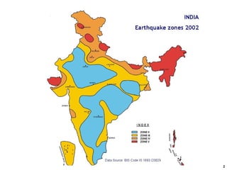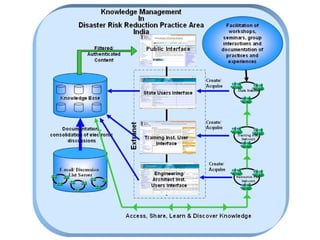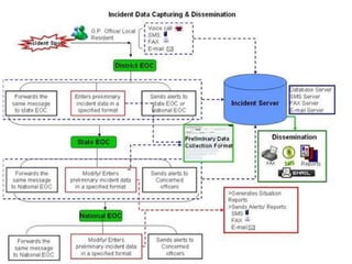 The document discusses the role of information and communication technology (ICT) in disaster risk management in India. It provides details on ICT systems and databases that can help with preparedness, response, recovery and mitigation efforts. These include hazard mapping, vulnerability assessments, disaster history databases, resource inventories, and GIS systems to facilitate planning and emergency response. Case studies are also presented on ICT tools currently used in India for disaster management.