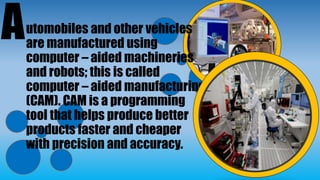 Manufacturers use computer-aided manufacturing (CAM) and computers to produce products faster, with more precision and accuracy. CAM is a programming tool that helps automate production using computer-controlled machinery and robots. Computers also manage raw materials, suppliers, costs, and inventory. They are used to design new machines and test them virtually before manufacturing. Some industries like car manufacturing are fully automated through computer-integrated manufacturing (CIM), where all processes are done by robots under computer control.