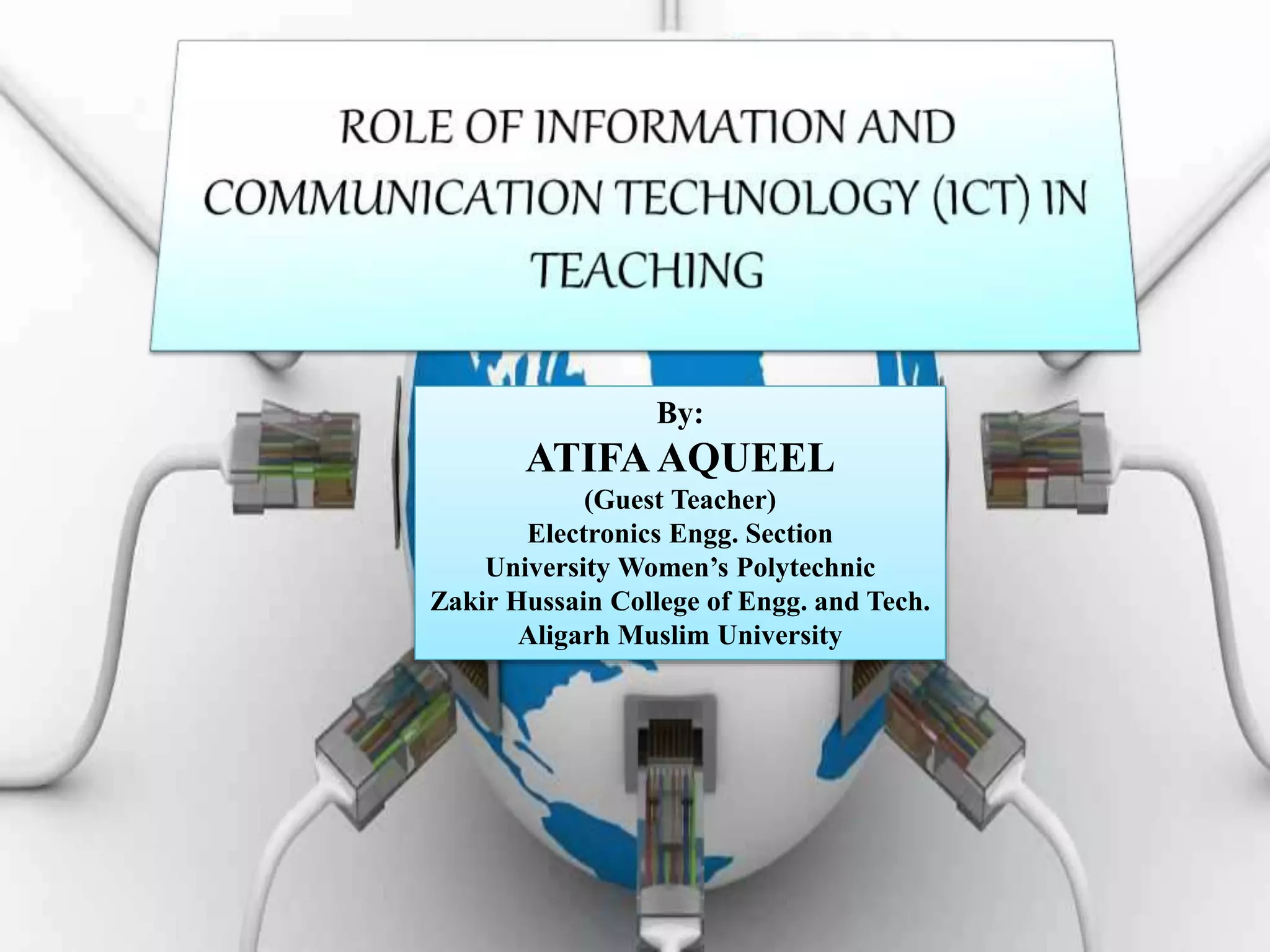 This document discusses the role of information and communication technology (ICT) in 21st century education. It begins by stating that students now need to be taught how to engage global connections and communicate collaboratively in a skilled way. ICT is then defined as newer digital technologies like computers and the Internet that can powerfully change and reform education. The document outlines how ICT provides interactive tools that can transform classrooms from teacher-centered to student-focused learning environments. It also discusses different ICT literacy levels teachers can achieve and examines the paradigm shift from traditional to ICT-based models of education. In conclusion, the document states that while ICT does not automatically improve teaching, it can accelerate and enhance learning when applied effectively.