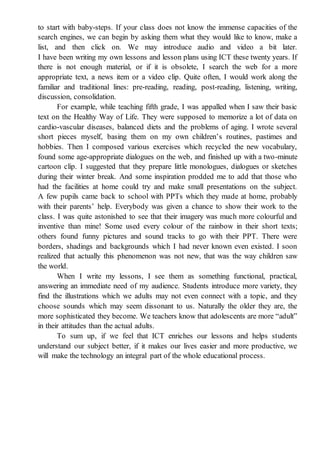3) Benefits of technology in the classroom include being able to access any information needed for a lesson from the internet and integrating different skills like reading, writing, listening and speaking into one lesson using an interactive whiteboard.