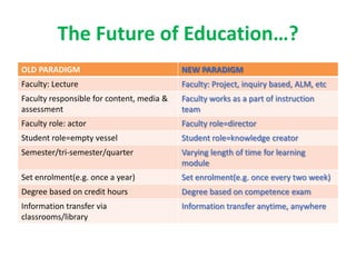 The document discusses the importance of using information and communication technologies (ICT) in teaching and learning. ICT, such as computers and the Internet, can expand access to education, strengthen education systems, and raise educational quality by making teaching and learning more engaging. The future of education involves preparing students with 21st century skills needed for the modern workplace, such as the ability to collaborate globally, access and analyze information, and engage in continuous independent learning. The document provides numerous online resources and websites that can be used to incorporate ICT into teaching practices and promote open and distance learning.