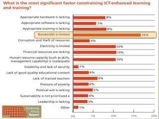 The document discusses challenges and opportunities for integrating ICT into African universities. It notes that while limited infrastructure and resources pose challenges, partnerships and strategic planning can help overcome barriers. Specifically, the document recommends identifying the roles of ICT in research and learning, conducting sound financial and pedagogical planning, enhancing ICT through inter-institutional collaboration, and developing skills adaptable to change. A case study highlights the Partnership for Higher Education in Africa project, which promotes open educational resources, capacity building, and collaboration between universities.