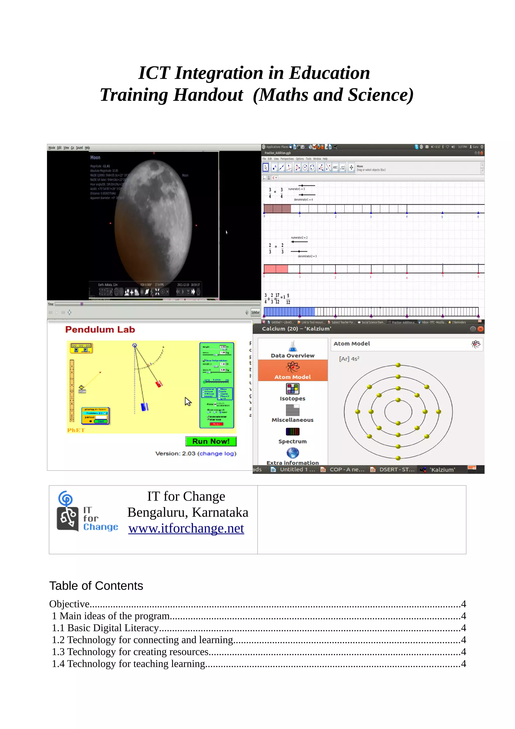 The document serves as a training handout for high school teachers on integrating ICT and digital literacy into their teaching of mathematics and science. It covers basic digital literacy, technology for connecting and learning, and resource creation, emphasizing the use of free and open-source software. The aim is to enhance teachers' skills in utilizing technology for effective teaching and professional development.