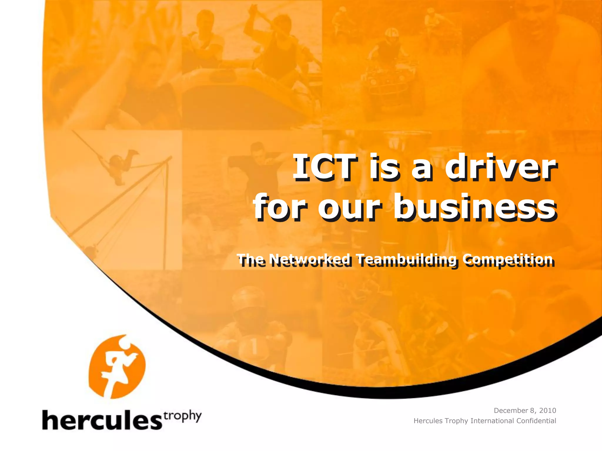 This document discusses how ICT (information and communications technology) is vital to Hercules Trophy International's strategy as a provider of business sports competitions. It describes Hercules Trophy International's online environment which includes tools for marketing, organization, and operations that help drive conversations with customers and achieve excellence worldwide. The ICT environment provides a competitive advantage and is maintained through a development process following Scrum principles.