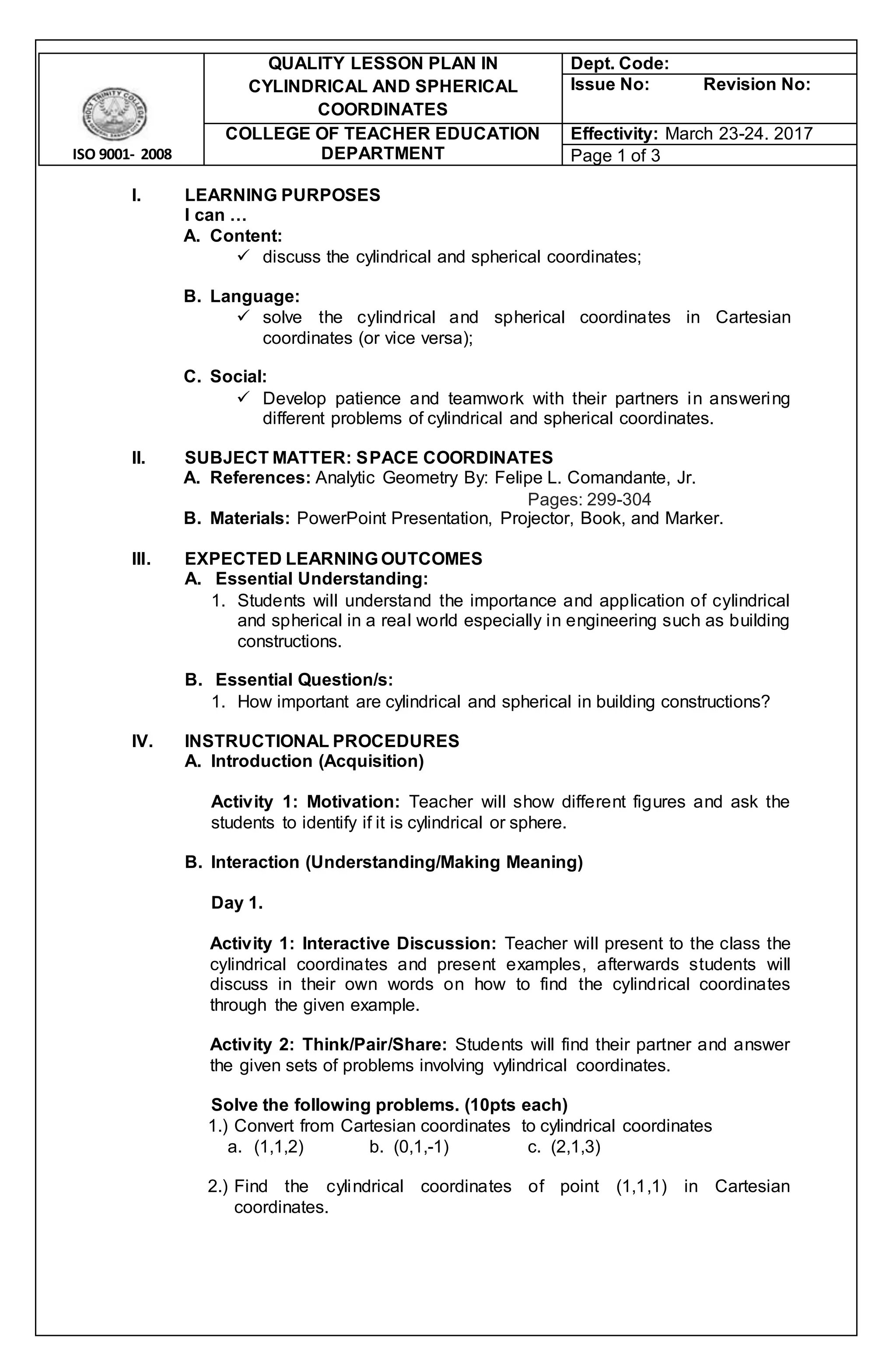 This lesson plan discusses cylindrical and spherical coordinates over two days. Day 1 focuses on cylindrical coordinates, defining them, providing examples, and having students complete practice problems converting between cylindrical and Cartesian coordinates. Day 2 introduces spherical coordinates and how they relate to cylindrical coordinates with more examples and problems combining the two systems. Students will work with partners to complete practice problems. Assessment will be with a paper-and-pencil test. For homework, students must find an equation relating the three coordinate systems. The goal is for students to understand and be able to work between the different spatial coordinate systems, especially as they apply to engineering and building constructions.