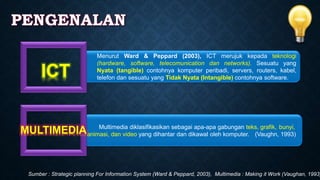 Dokumen ini membincangkan peranan teknologi maklumat dan komunikasi (ICT) serta multimedia dalam pendidikan, menekankan kepentingan integrasi teknologi dalam pengajaran dan pembelajaran. Terdapat klasifikasi alat ICT yang berbeza seperti alat maklumat, situasi, konstruktif, komunikasi, dan kerjasama yang menyokong proses pembelajaran. Walau bagaimanapun, terdapat cabaran seperti gangguan maklumat dan kekurangan interaktiviti di kalangan pelajar yang perlu ditangani untuk meningkatkan keberkesanan penggunaan ICT dalam pendidikan.