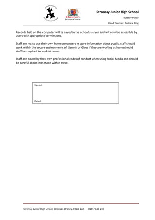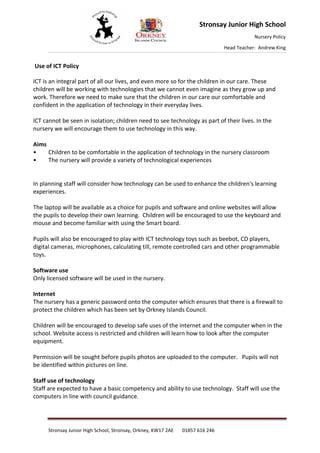 The document outlines Stronsay Junior High School's nursery ICT policy. The policy aims to make children comfortable and confident with technology as they will be using it throughout their lives. The nursery will provide a variety of technological experiences for children to use ICT as part of their everyday lives. Only licensed software will be used and the school has firewall protection on internet access which is restricted. Permission will be sought before uploading photos of children online and children will not be identified. Staff are expected to use technology appropriately and store information securely.