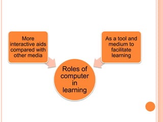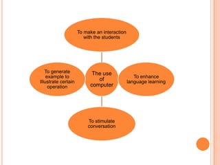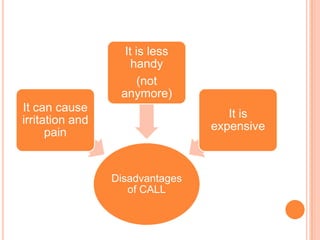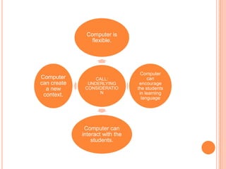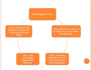 Computer-assisted language learning (CALL) uses computers to support language teaching and learning. The effectiveness of CALL depends on social and individual student differences. Methods for teaching language have evolved over time in response to weaknesses in previous methods, with CALL now seen as better than other methods in several ways. The document discusses CALL and different language teaching methods.