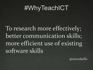 The document discusses reasons for teaching information and communication technology (ICT) in schools. It provides perspectives from several Twitter users advocating for ICT education, citing benefits like better research skills, communication skills, use of software, and preparation for a changing world. ICT is described as an innovative subject that can connect students globally and engage them through interesting and creative means. It also allows lifelong learning. Overall the document makes a case that ICT education is important for students' participation in the digital age.
