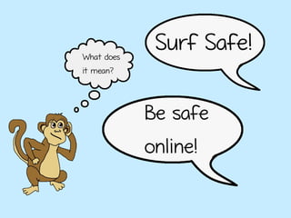 This document discusses using the internet for games, email, and homework. It asks what personal information is and instructs the reader to make a poster for Mitch with one tip to keep him safe online, including a drawing of the tip and writing their name on the back.