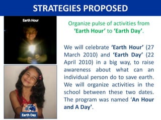 The document discusses plans by a student group called ICT Seagulls to raise awareness about environmental issues through art. They brainstormed potential project topics related to the theme of arts and had 100 students vote, with the majority choosing "Save Mother Earth." After further discussion, they refined their goal to sharing their "dream of a beautiful living earth" through arts. The group researched the issues, conducted a survey that revealed varying levels of awareness, and identified key root causes for the low priority given to environmental protection like lack of fun activities and public/sponsor interest. They proposed strategies like organizing more school activities on their theme to increase engagement.
