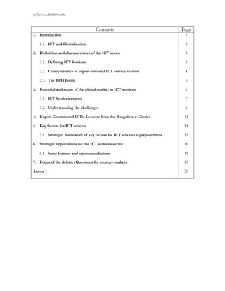 The discussion paper explores the role of information and communication technology (ICT) services in fostering economic development, especially in developing countries, by leveraging global outsourcing opportunities. It assesses the characteristics of export-oriented ICT service sectors, identifies critical success factors, and presents an ICT services e-preparedness matrix for policy makers and strategy makers. The document emphasizes the need for comprehensive national development strategies to harness the capabilities of ICT services for enhancing competitiveness in the context of globalization.