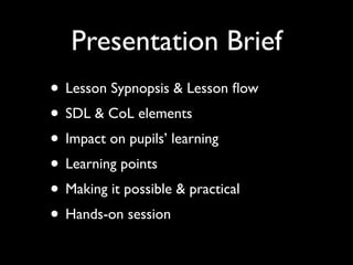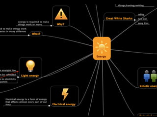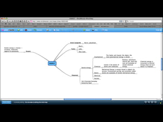 This document provides an overview of a science lesson on kinetic energy that incorporates ICT tools. The 60-minute lesson will have students use online mind mapping software to create maps showing their understanding of how energy is required to do work. Working in groups, students will discuss roles and responsibilities for developing different concepts on their shared mind maps. The use of online tools allows students to monitor and provide feedback on each other's work in a way that promotes collaborative and self-directed learning. The teacher emphasizes that patience is needed when working with technology and that students should feel comfortable using the online tools.