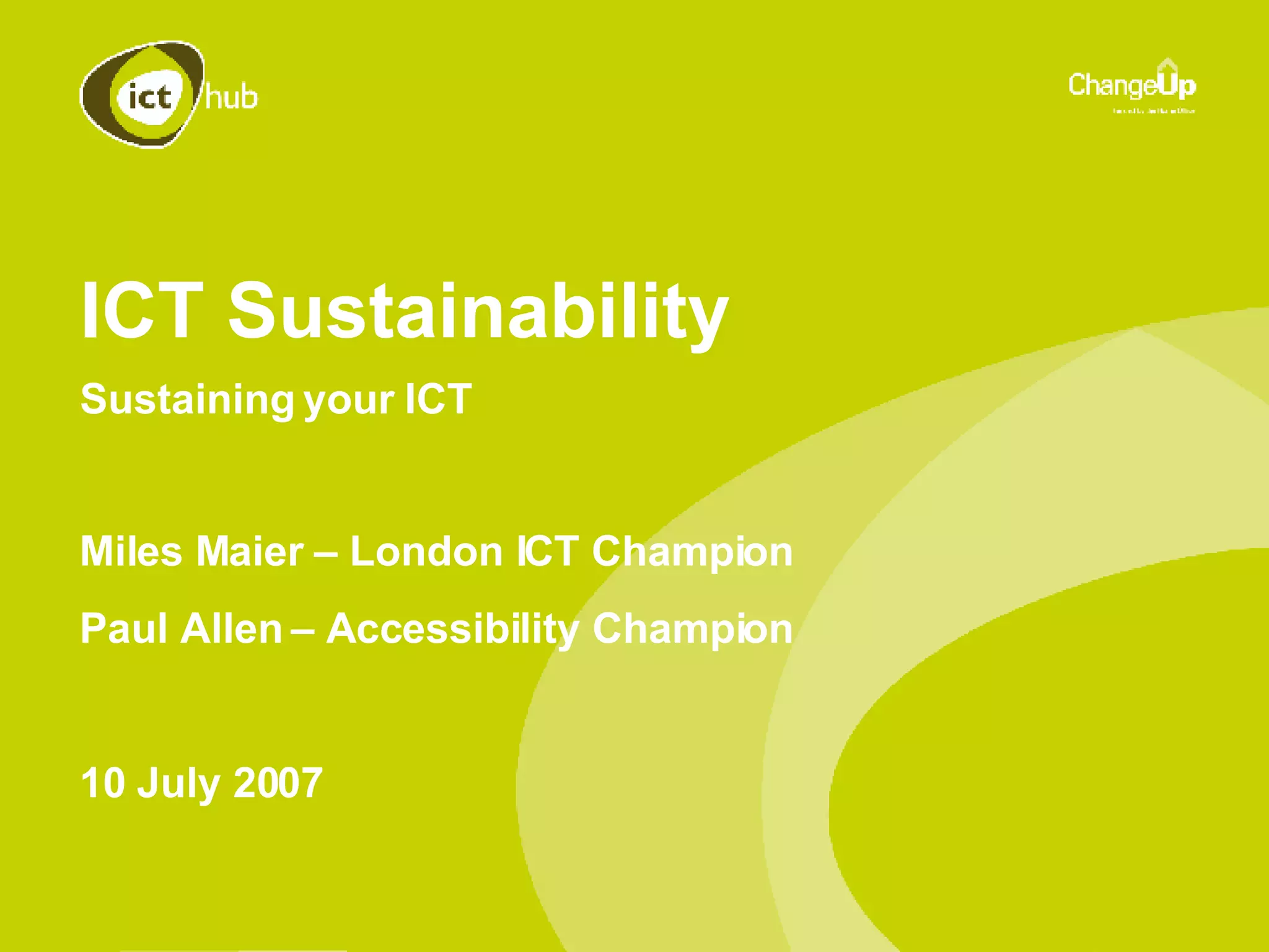 The document discusses resources for promoting sustainable ICT practices in the voluntary and community sector in the UK. It describes the ICT Champion program which advocates for sustainable ICT, the ICT Hub partnership which provides guidance and research, and the ICT Hub Knowledgebase which offers advice on various ICT topics. It also mentions the ICT Suppliers Directory and the work of the London ICT Accessibility Champion to promote assistive technologies. Key resources and contact information are provided.