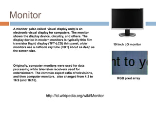The document provides information about various ICT objects including a monitor, keyboard, printer, scanner, mouse, CPU, floppy disk, CD-ROM, DVD-ROM, flash disk, hard disk, telephone, ISDN, facsimile, fiber optic, leased line, wireless communication, satellite, antenna, cellular network, server, client, router, modem, internet, internet user, hacker, cracker, carding, and how to share information. It also discusses the historical development of ICT from ancient civilizations to the modern period.