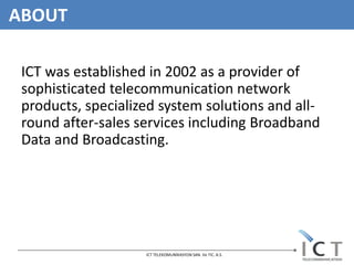 ICT is a Turkish company established in 2002 that provides telecommunication network products, specialized system solutions, and after-sales services. It has 47 employees, over €22 million in annual revenue, and serves over 100 customers in 12 countries. ICT specializes in broadcast services, broadband connectivity, satellite news gathering vehicles, and installation/maintenance of antenna systems.