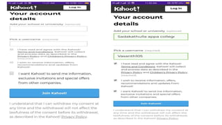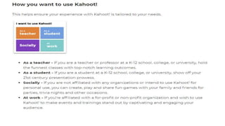 The document discusses various ICT tools that can be used for e-resources and e-content in higher education, including augmented reality, virtual reality, online learning, online social networking, and cloud computing. It then provides more details on specific tools like Mind Mapping, Kahoot, e-content creation and video making, YouTube channel creation, SlideShare, and how the app Kahoot can be used. The document contains steps and screenshots for setting up accounts and utilizing some of these digital tools for educational purposes.
