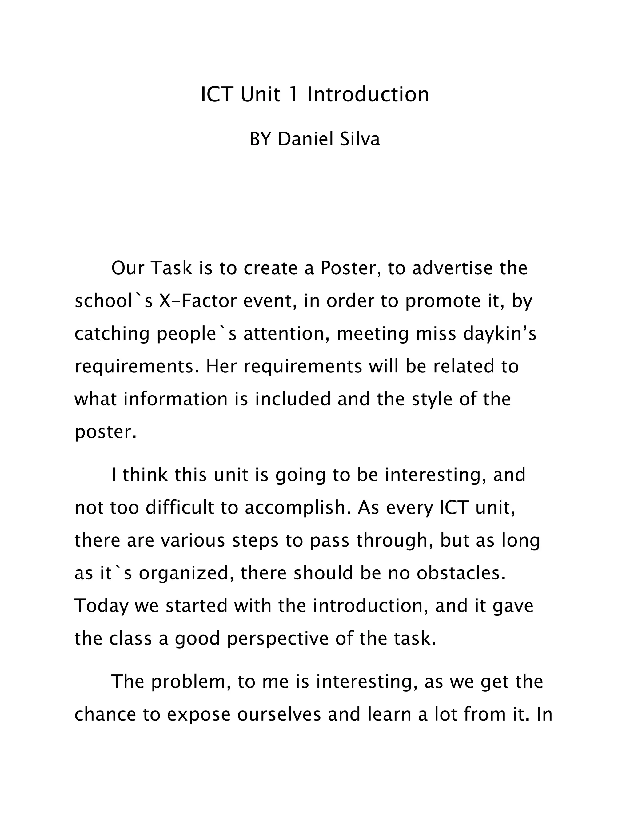 This document provides an introduction to an ICT unit where students will create a poster to advertise their school's X-Factor event. It outlines the task requirements set by the teacher, which will relate to the information and style that must be included in the poster. The student believes the unit will be interesting and not too difficult if approached in an organized manner. They view the poster assignment as an interesting problem that will give them exposure and a chance to promote the event to the whole school community. Community service is an essential criteria since the posters will connect the students' thinking to society and help the community.
