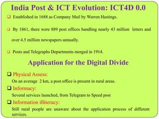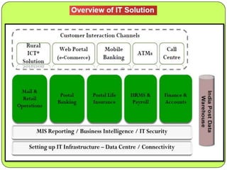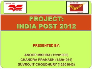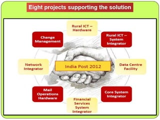 India Post has been providing postal services since 1688 and has expanded to include over 1,30,000 rural post offices. In 1991, it began introducing computers to post offices to improve customer service and enable paperless transactions. From 2006-2012, 25,000 post offices were computerized. The India Post 2012 project aims to modernize all post offices through developing integrated software, establishing data centers, and connecting post offices through a nationwide network. This will help increase revenue, improve customer service, and support new lines of business through IT enablement. The project is expected to benefit customers through improved financial inclusion, and benefit employees through new skills and increased productivity.