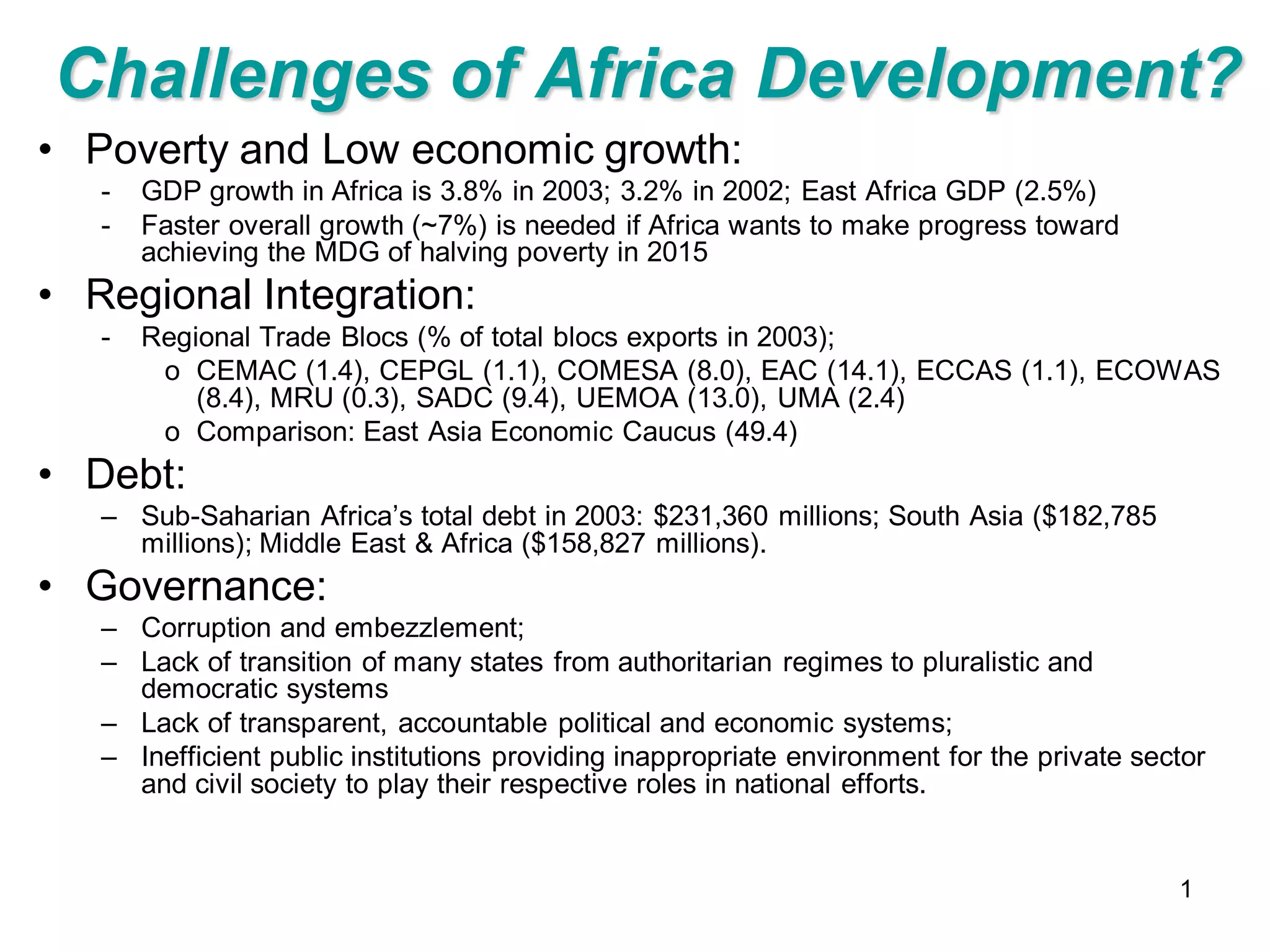 The document discusses several key challenges facing Africa's development: