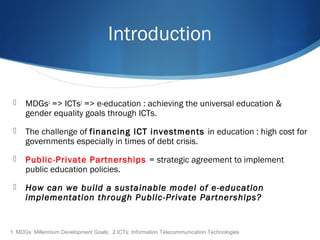 The document discusses public-private partnerships (PPPs) in information and communication technologies (ICT) for education. It outlines how PPPs can help finance ICT investments in education by providing resources from the private sector. Successful PPP examples that have helped achieve education goals through e-learning and mobile learning are described, such as the ITU Internet Training Centers initiative partnership between ITU and Cisco. Challenges to effective PPPs include issues around resources, evaluation, regulations, and national sovereignty. Recommendations to strengthen PPPs include creating private sector incentives, implementing good regulatory frameworks, setting clear objectives, and promoting good governance.