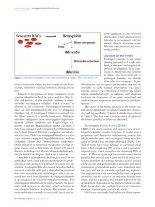 This document provides an overview of conjugated hyperbilirubinemia in older infants and children. It begins with an introduction to jaundice and bilirubin metabolism. The main causes of conjugated hyperbilirubinemia discussed are extrahepatic biliary atresia, "idiopathic" neonatal hepatitis, and Alagille syndrome. Extrahepatic biliary atresia is the most common cause and involves a progressive inflammatory process affecting the biliary tree. "Idiopathic" neonatal hepatitis refers to cases where no clear cause is identified. Alagille syndrome is a genetic disorder characterized by bile duct paucity and other cardiac, facial and skeletal abnormalities. The document provides details on