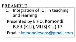 This document discusses the integration of information and communication technology (ICT) in teaching and learning. It defines ICT and outlines its benefits, including being a source of knowledge, medium for transmitting knowledge, and means of interaction. The document describes various ICT tools like multimedia PCs, the internet, and digital libraries. It explains how these tools can enhance learning through visualization, collaboration, motivation, and catering to different learning styles. Overall, the document promotes the use of ICT in education to improve the quality and flexibility of learning.