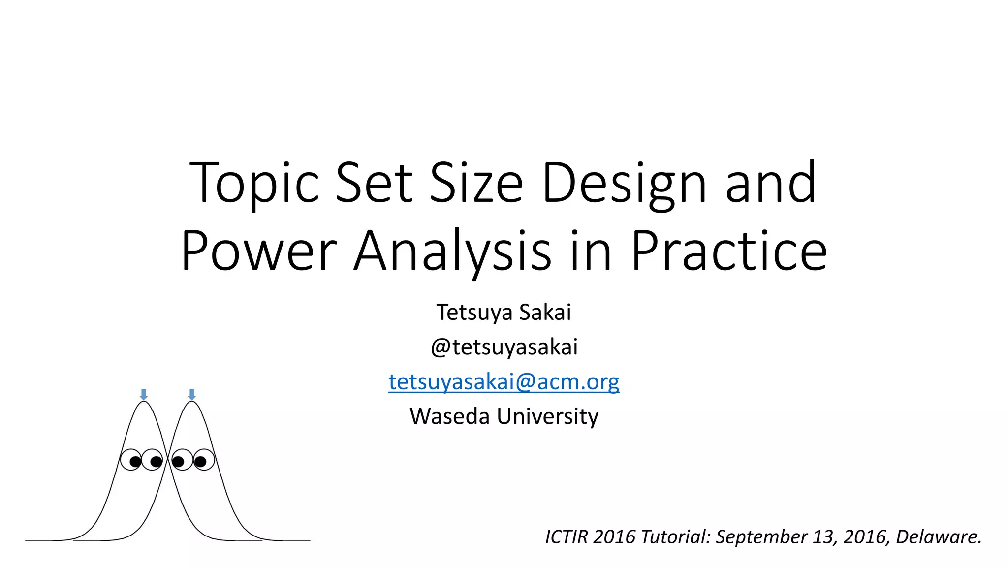 This document outlines a half-day tutorial on topic set size design and power analysis in information retrieval (IR) experiments. The tutorial will cover determining the number of topics for a new test collection, checking if IR experiments are overpowered or underpowered, and using Excel and R scripts for topic set size design and power analysis. It provides background on statistical significance testing concepts like t-tests, ANOVA, p-values, and type I and type II errors. The tutorial agenda includes hands-on exercises for applying paired t-tests, one-way ANOVA, and power analysis to sample IR topic-by-run matrices using Excel and R scripts.