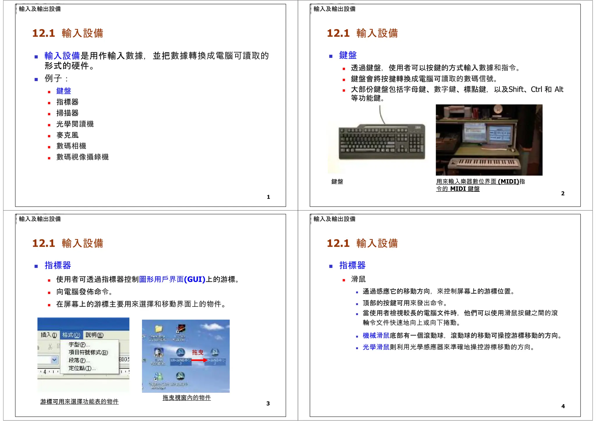 文档介绍了输入设备和输出设备的基本概念及其功能,包括键盘、鼠标、扫描器、显示器等。输入设备用于将数据转换为计算机可读格式,而输出设备则将数字信息转为人类可理解的形式。每种设备的具体功能、优缺点和应用场景也有详细描述。