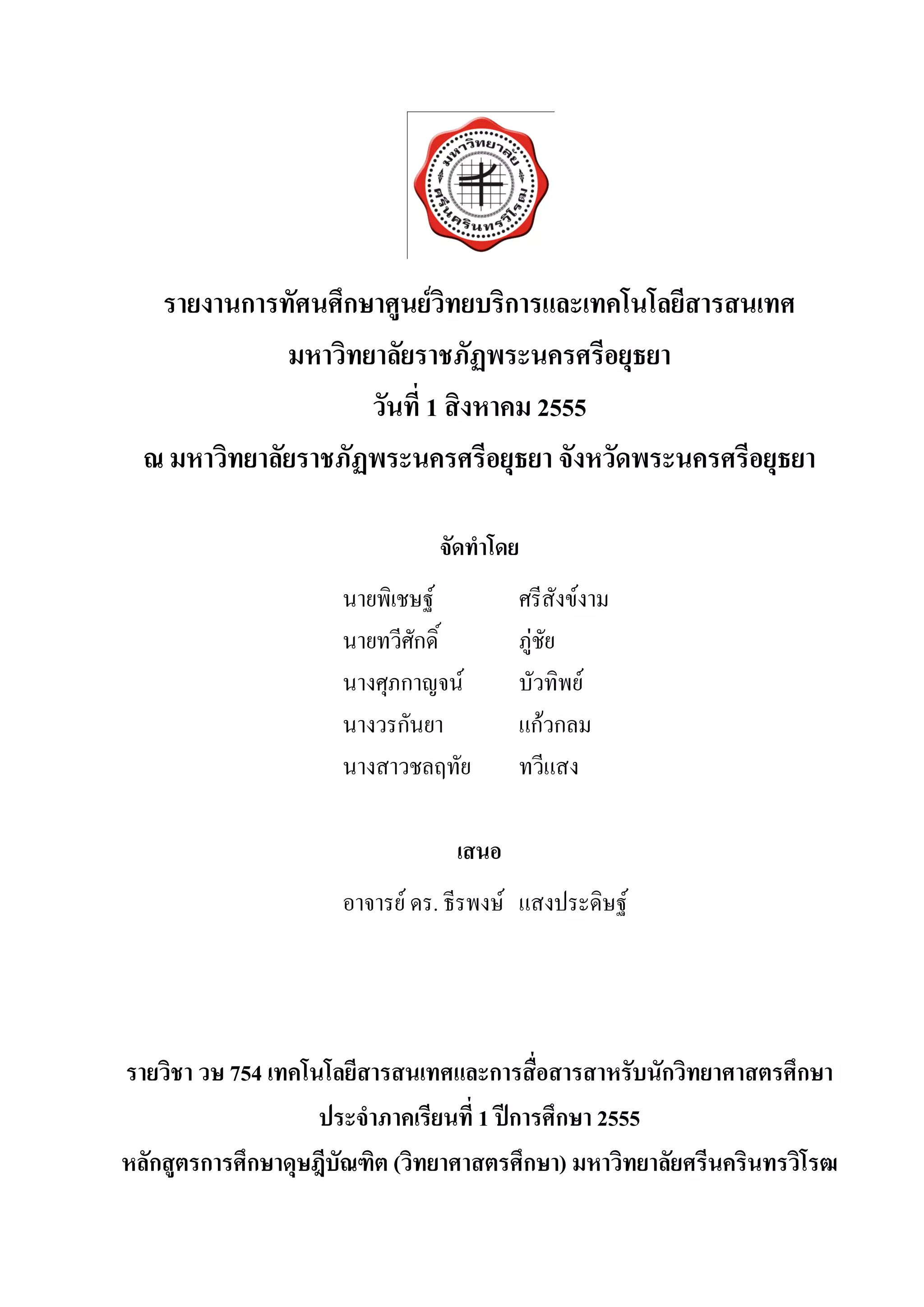 คํานํา รายงานฉบับนี้จัดทําขึ้นเพื่อประมวลความรูและกิจกรรม การทัศนศึกษาศูนยวิทยบริการและเทคโนโลยี สารสนเทศ มหาวิ ท ยาลั ย ราชภั ฏพระนครศรี อ ยุธยา เมื่ อ วั น ที่ 1 สิงหาคม 2555 ณ มหาวิทยาลั ย ราชภั ฏ พระนครศรีอยุธยา จังหวัดพระนครศรีอยุธยา ซึ่งเปนสวนหนึ่งของการจัดการเรียนรูรายวิชาวษ 754 เทคโนโลยี สารสนเทศและการสื่อสารสาหรับนักวิทยาศาสตรศึกษา ประจําภาคเรียนที่ 1 ปการศึกษา 2555 ของหลักสูตร การศึกษาดุษฎีบัณฑิต (วิทยาศาสตรศึกษา) มหาวิทยาลัยศรีนครินทรวิโรฒ คณะผูจดทําหวังเปนอยางยิ่งวารายงานฉบับนี้ จะเปนประโยชน และเปนแนวทางในการจัดกิจกรรมทัศน ั ศึกษาสําหรับผูที่สนใจในครั้งตอไป คณะผูจัดทํา
