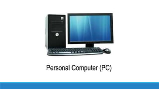 This document provides information about different types of computers. It begins by defining what a computer is and its basic functions of data input, processing, output, and storage. It then describes various types of computers including desktops, laptops, tablets, servers, smartphones, wearables, game consoles, and smart TVs. It provides details about the typical components of desktop computers like the computer case, monitor, keyboard, mouse, and common peripherals. It also discusses hardware and software components as well as uses of computers.