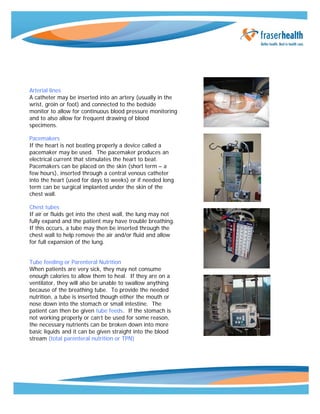 The document discusses common equipment used in intensive care units (ICU) to monitor patients and treat illnesses. Patients in the ICU are often connected to bedside monitors that track vital signs like heart rate, blood pressure, oxygen levels. Intravenous (IV) catheters are used to deliver fluids and medications into blood vessels. Ventilators are used to support breathing by inserting breathing tubes through the mouth or tracheostomy in the neck. Other equipment discussed includes arterial lines to monitor blood pressure, pacemakers to regulate abnormal heart rhythms, chest tubes to drain fluids from the lungs, and feeding tubes for providing nutrition.