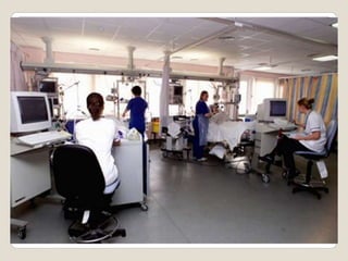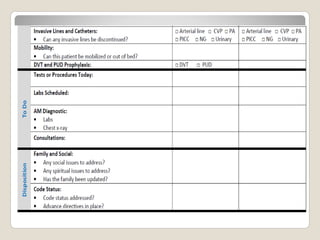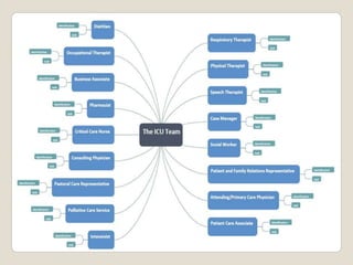 The document describes an interdisciplinary ICU team treating a 75-year-old asthma patient. It outlines the roles of team members including the consulting physician, ICU physician, clinical pharmacist, ICU nurse, nursing aid, and ICU housekeeper. It also discusses tools like daily goals worksheets to improve communication between the team and track the patient's progress. Developing highly skilled teams is aimed at improving patient outcomes through increased care, medical knowledge, communication, and a systems-based approach.