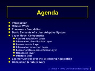 This document presents a machine learning-based framework for adaptive mobile learning (m-learning) aimed at personalizing the learning experience based on user-specific profiles and contextual information. The framework consists of several layers, including context acquisition, information classification, and learner model layers, which work together to adapt learning content and enhance the interaction between the user and the system. The authors also outline future work that includes ongoing implementation and evaluation of the system's effectiveness.