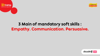 The document emphasizes the importance of both soft skills, like communication and empathy, and hard skills in professional development. It advocates for a user-centered approach in product development by understanding user goals and pain points, while also highlighting the significance of measurable goals and continuous learning. Additionally, it notes the Pareto principle, suggesting that a small percentage of functionalities can drive a majority of user engagement and revenue.
