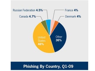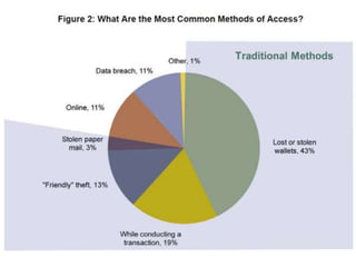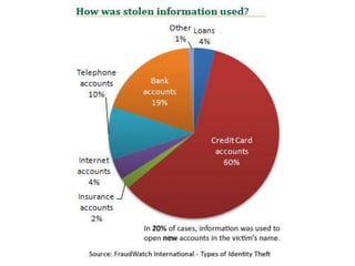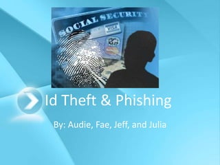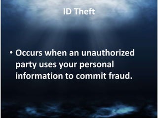ID theft occurs when personal information is used without authorization to commit fraud, affecting over 10 million people annually in the US. Personal information can be obtained through phishing scams, lost or stolen wallets, mail theft, or hacking of online transactions. To prevent ID theft, one should shred mail, update contact information, avoid sharing personal details, and monitor credit reports. If a victim, one should file a police report, place fraud alerts on credit files, and keep records of recovery efforts. Phishing involves deceiving people into sharing private credentials through electronic messages, and has evolved from early financial scams to targeting social networks and specific individuals.