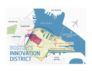 The vision for Boston's innovation district aims to create a sustainable ecosystem that fosters collaboration among entrepreneurs and enhances job growth through proximity and shared resources. Key initiatives include developing flexible housing options for innovators, providing public spaces that support collaboration, and leveraging Boston's educated talent pool to drive innovation. The plan emphasizes adaptability, inclusivity, and livability to ensure that the benefits of innovation extend to all residents.