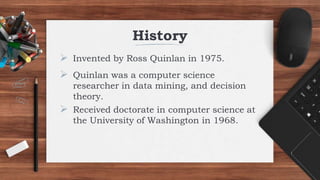 The ID3 algorithm is a decision tree learning algorithm developed by Ross Quinlan. It builds classification models in the form of a decision tree from a set of labeled training data. The algorithm works by selecting the attribute that is most useful for classifying the training examples at each step, starting with the root node. It then splits the examples into smaller subsets based on the value of that attribute. This process continues recursively on each derived subset until the subsets are pure or until stopping criteria are met. The resulting decision tree can then be used to classify new or unknown data instances.