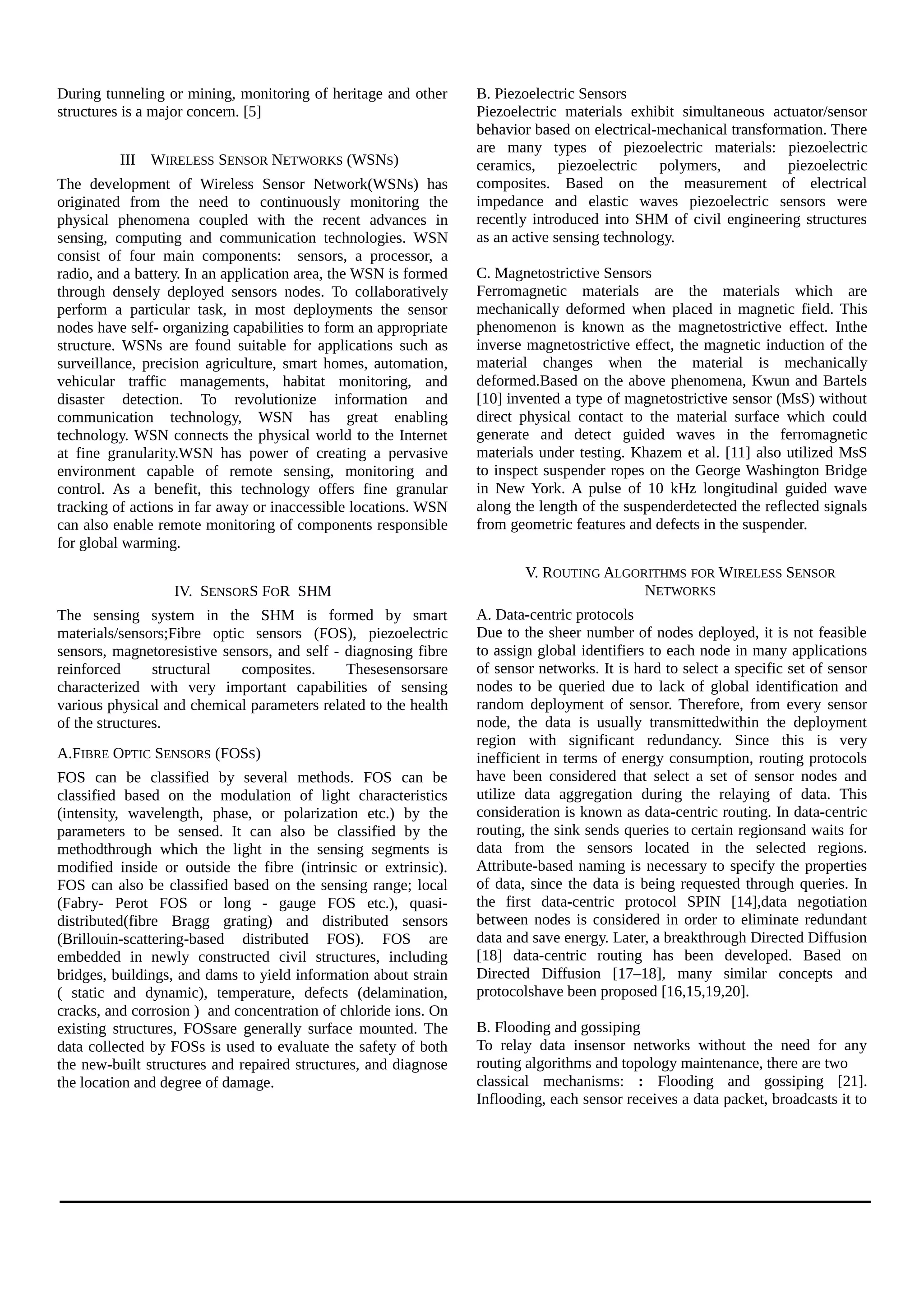 The document reviews the advancements in structural health monitoring (SHM) systems using wireless sensor networks (WSNs), highlighting their benefits like ease of installation and low cost. It discusses the importance of SHM across various structures, including bridges and buildings, and presents different types of sensors employed in monitoring. Key challenges such as data quality, reliability, scalability, and real-time response within WSNs are also addressed.