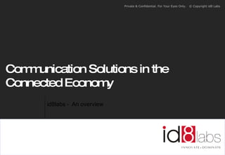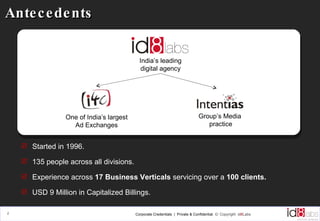 id8labs is a digital agency that provides communication solutions across 17 business verticals to over 100 clients. With 135 employees across India and revenues of USD 9 million, id8labs offers a full range of services including web development, digital marketing, e-learning, multimedia solutions, and customer relationship management consulting. id8labs also has a full-service media offering for ad sales, search, social media, and a proprietary ad exchange technology that can integrate across multiple digital platforms.