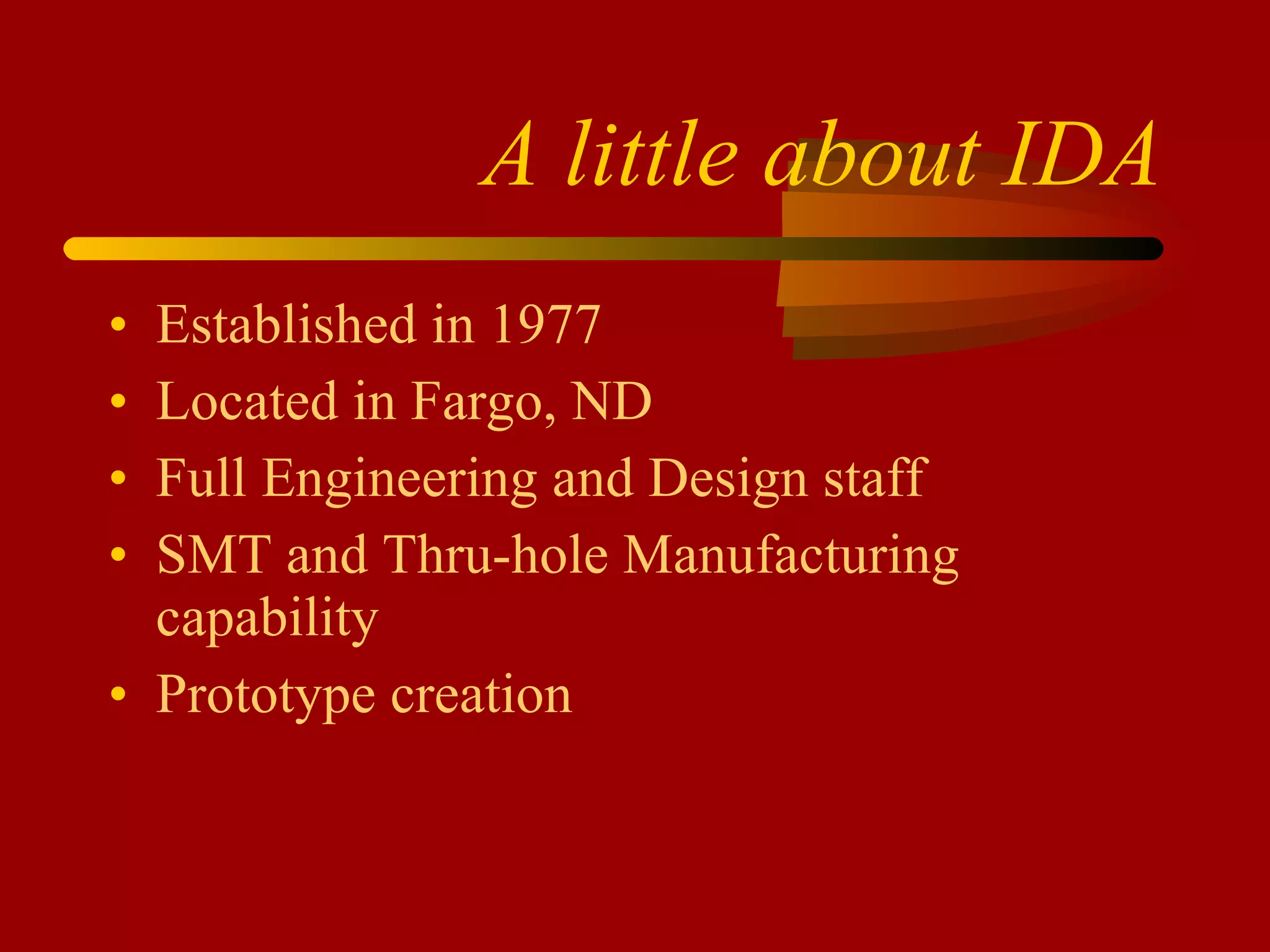 IDA Corporation is an engineering company located in Fargo, ND that has been in business since 1977. They specialize in two-way radio equipment including base stations, remote controls, consoles, and termination panels. They also offer a GPS/AVL fleet management system called TRAKIT that provides vehicle tracking and data communication solutions for fleet management. TRAKIT has a variety of hardware and software options and is used by many government and commercial customers.