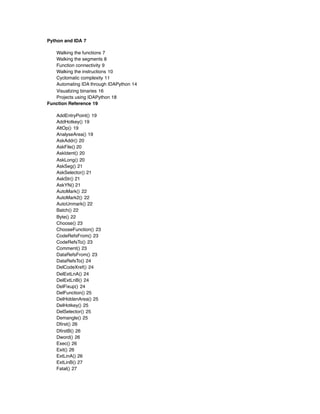 This document introduces IDAPython, an extension for IDA that brings Python scripting capabilities to aid in binary analysis. It provides examples of using IDAPython to iterate through functions, segments, instructions, calculate cyclomatic complexity, and automate IDA. The examples demonstrate basic usage and provide a starting point for interested individuals. The document also includes a function reference section describing the various IDAPython API functions.