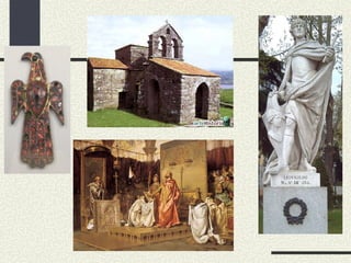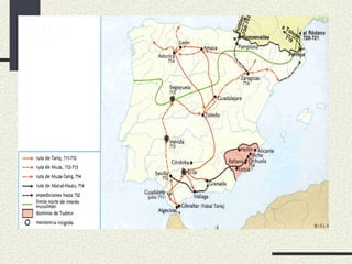 c) Orixe dosreinos cristiáns Invasión musulmana conquista da maior parte da península, agás as zonas do norte, montañosas e de escaso interés para os invasores núcleos de resistencia cristiáns. 2 zonas: Zona occidental : resistencia cristiáns na zona montañosa cantábrica orixe na mítica batalla de Covadonga (722?) formación do Reino de Asturias. Zona oriental : núcleos de resistencia na zona dos Pireneos, impulsados polos reis francos para impedir as razzias musulmáns intervención de Carlomagno (emperador franco) e o seu fillo Luís o Piadoso Marca Hispánica (fronteira franca co Emirato de Córdoba) formada por condados navarros, aragoneses e catalanes Estes condados foron co tempo gañando autonomía fronte aos reis francos independencia do reino de Pamplona e do condado de Aragón no século IX e dos condados catalanes no S.X.