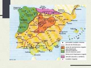 2ª Etapa 507-569: Sitúan a capital en Toledo (centricidade) e toman tierras ocupadas polos bizantinos (costa andaluza) e Baleares (vándalos). 3ª Etapa 569-711: Consolidación do dominio na península. Conquista do reino suevo ( Leovilxildo , 585) e sometemento de enclaves bizantinos. Con Suintila (625) toda a península en mans visigodas. Continuas campañas contra os pobos montañeses . Mapa da segunda etapa. Reino de Toledo (507-569) Fuente: Cartoteca del CNICE