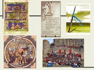 b) Crise social:revoltas populares. Crise demográfica e ec dos S.XIV e XV empeoramento das condicións de vida populares revoltas. Enfrontamento social en Barcelona (med. S.XV): Busca (artesáns e peq comerciantes) vs. Biga (oligarquía local) agravamento da crise. Remensa no campo catalán (1462-1486): Malos usos dos señores (abusos sobre os seus campesiños) revolta popular ata 1486 (eliminación de malos usos por Fernando II o Católico ). Persecucións xudeus: crise xeral acusación de seren culpables de todos os males persecucións e matanzas (progroms). Revolta irmandiña (med. S.XV) en Galicia : crise ec da presión fiscal e abusos de nobres e abades sobre campesiños formación de irmandades para opoñerse a estes malos usos guerras irmandiñas derrota dos irmandiños victoria nobiliaria dura represión e axustizamento dos líderes irmandiños.