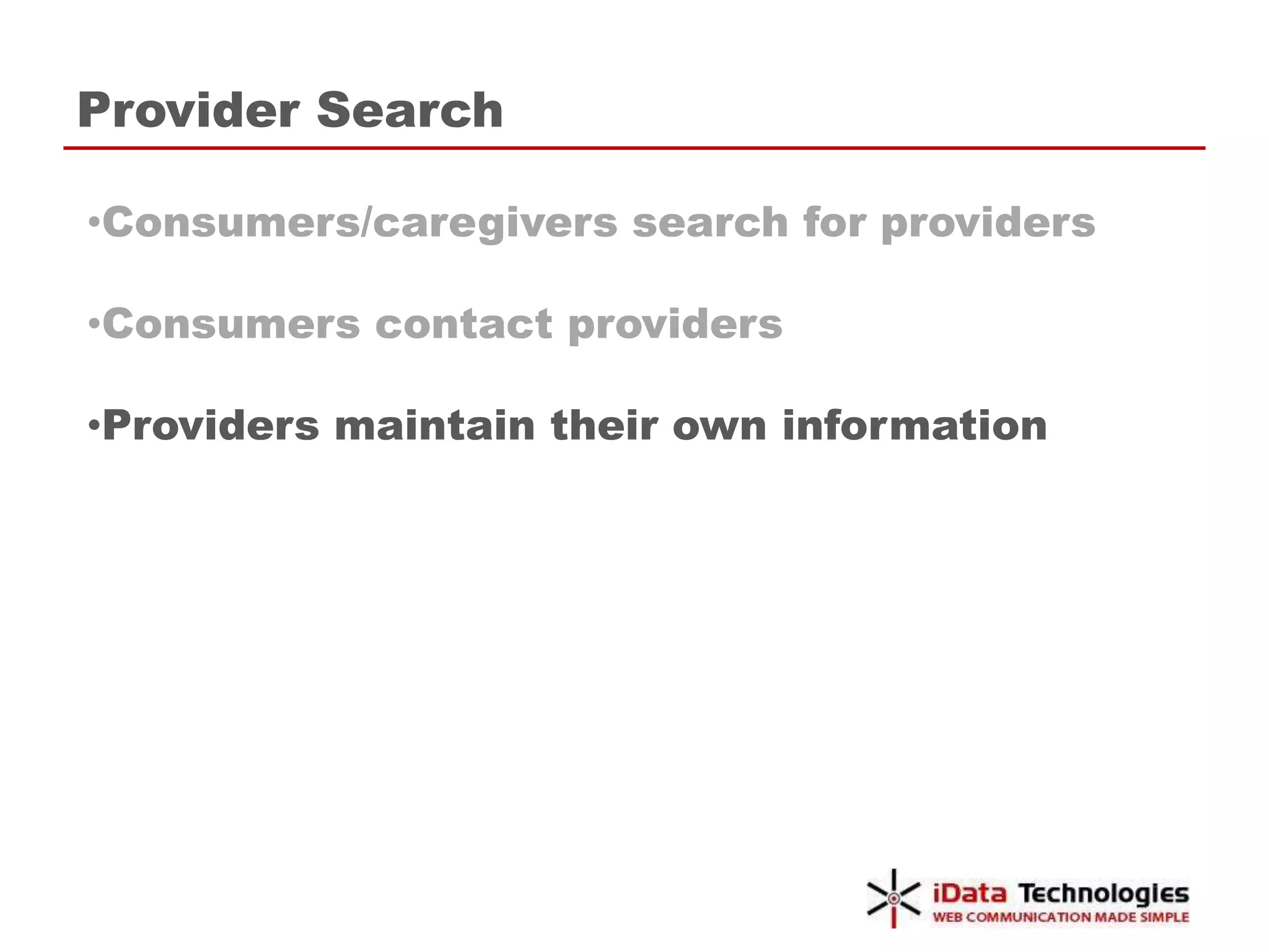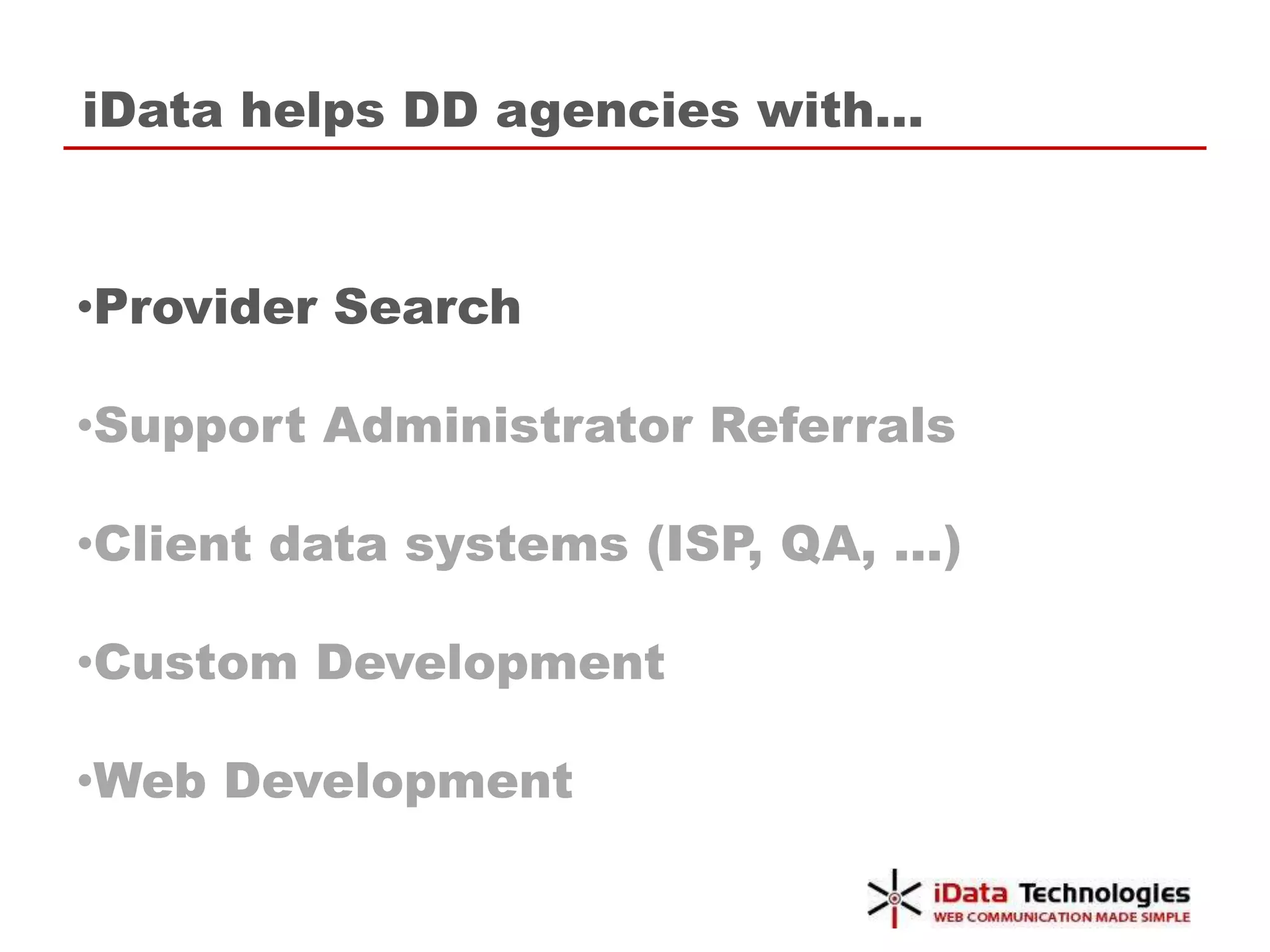 iData helps developmental disability agencies with various services including provider search functionality, support administrator referrals, client data systems, custom development and web development. The provider search allows consumers/caregivers to search for providers and then contact providers directly. For support administrator referrals, support administrators enter referral information, a coordinator reviews and approves the referrals, and then the referrals are published to a secure, searchable database where providers can find consumers they can serve and contact the support administrator.